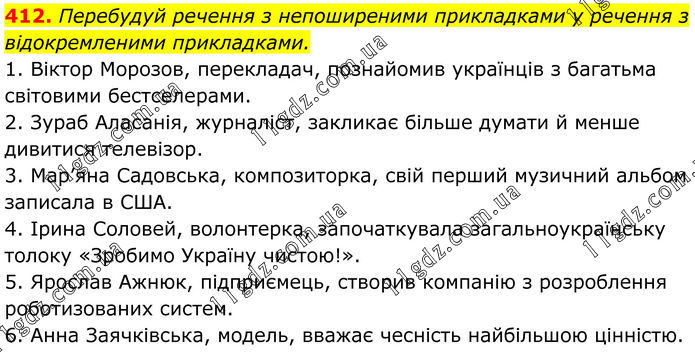 412. Перебудуй речення з непоширеними прикладками у речення з відокремленими прикладками. 1. Віктор Морозов, перекладач, познайомив українців з багатьма світовими бестселерами. 2. Зураб Аласанія, журналіст, закликає більше думати й менше дивитися телевізор. 3. Мар’яна Садовська, композиторка, свій перший музичний альбом записала в США. 4. Ірина Соловей, волонтерка, започаткувала загальноукраїнську толоку «Зробимо Україну чистою!». 5. Ярослав Ажнюк, підприємець, створив компанію з розроблення роботизованих систем. 6. Анна Заячківська, модель, вважає чесність найбільшою цінністю.