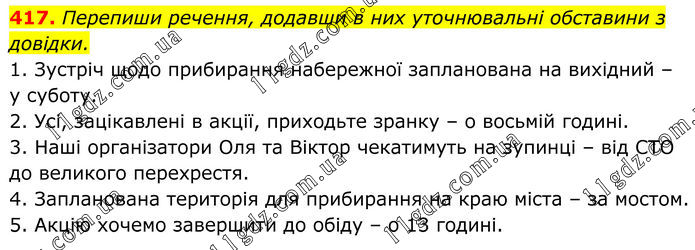 417. Перепиши речення, додавши в них уточнювальні обставини з довідки. 1. Зустріч щодо прибирання набережної запланована на вихідний – у суботу. 2. Усі, зацікавлені в акції, приходьте зранку – о восьмій годині. 3. Наші організатори Оля та Віктор чекатимуть на зупинці – від СТО до великого перехрестя. 4. Запланована територія для прибирання на краю міста – за мостом. 5. Акцію хочемо завершити до обіду – о 13 годині.