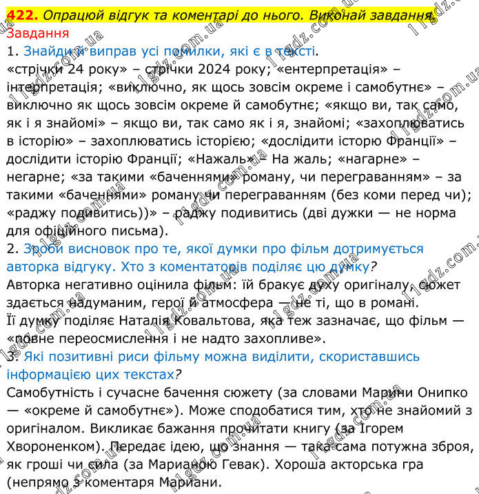 422. Опрацюй відгук та коментарі до нього. Виконай завдання. Завдання 1. Знайди й виправ усі помилки, які є в тексті. «стрічки 24 року» – стрічки 2024 року; «ентерпретація» – інтерпретація; «виключно, як щось зовсім окреме і самобутнє» – виключно як щось зовсім окреме й самобутнє; «якщо ви, так само, як і я знайомі» – якщо ви, так само як і я, знайомі; «захоплюватись в історію» – захоплюватись історією; «дослідити історю Франції» –дослідити історію Франції; «Нажаль» – На жаль; «нагарне» – негарне; «за такими «баченнями» роману, чи переграванням» – за такими «баченнями» роману чи переграванням (без коми перед чи); «раджу подивитись))» – раджу подивитись (дві дужки — не норма для офіційного письма). 2. Зроби висновок про те, якої думки про фільм дотримується авторка відгуку. Хто з коментаторів поділяє цю думку? Авторка негативно оцінила фільм: їй бракує духу оригіналу, сюжет здається надуманим, герої й атмосфера — не ті, що в романі. Її думку поділяє Наталія Ковальтова, яка теж зазначає, що фільм — «повне переосмислення і не надто захопливе». 3. Які позитивні риси фільму можна виділити, скориставшись інформацією цих текстах? Самобутність і сучасне бачення сюжету (за словами Марини Онипко — «окреме й самобутнє»). Може сподобатися тим, хто не знайомий з оригіналом. Викликає бажання прочитати книгу (за Ігорем Хвороненком). Передає ідею, що знання — така сама потужна зброя, як гроші чи сила (за Марианою Гевак). Хороша акторська гра (непрямо з коментаря Мариани.