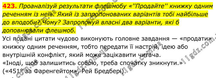 423. Проаналізуй результати флешмобу «''Продайте'' книжку одним реченням із неї». Який із запропонованих варіантів тобі найбільше до вподоби? Чому? Запропонуй власні два варіанти, які б доповнювали флешмоб. Усі подані цитати чудово виконують головне завдання — «продати» книжку одним реченням, тобто передати її настрій, ідею або внутрішній конфлікт, який може зацікавити читача. «Іноді, щоб залишитись собою, треба спочатку зникнути.» («451° за Фаренгейтом», Рей Бредбері).