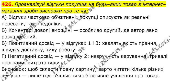 426. Проаналізуй відгуки покупців на будь–який товар в інтернет–магазині зроби висновки про те чи: А) Відгуки частково об’єктивні: покупці описують як реальні переваги, так і недоліки. Б) Коментарі доволі емоційні — особливо другий, де автор явно розчарований. В) Позитивний досвід — у відгуках 1 і 3: хвалять якість прання, швидку доставку, тиху роботу. Г) Негативний досвід — у відгуку 2: незручність керування, тривалі програми, витрата води. Висновок: щоб скласти повну картину, варто читати кілька різних відгуків — лише тоді з’являється об’єктивне уявлення про товар.