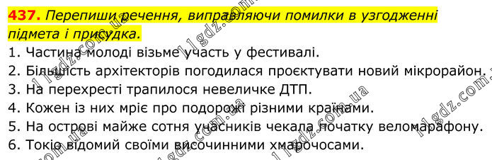 437. Перепиши речення, виправляючи помилки в узгодженні підмета і присудка. 1. Частина молоді візьме участь у фестивалі. 2. Більшість архітекторів погодилася проєктувати новий мікрорайон. 3. На перехресті трапилося невеличке ДТП. 4. Кожен із них мріє про подорожі різними країнами. 5. На острові майже сотня учасників чекала початку веломарафону. 6. Токіо відомий своїми височинними хмарочосами.
