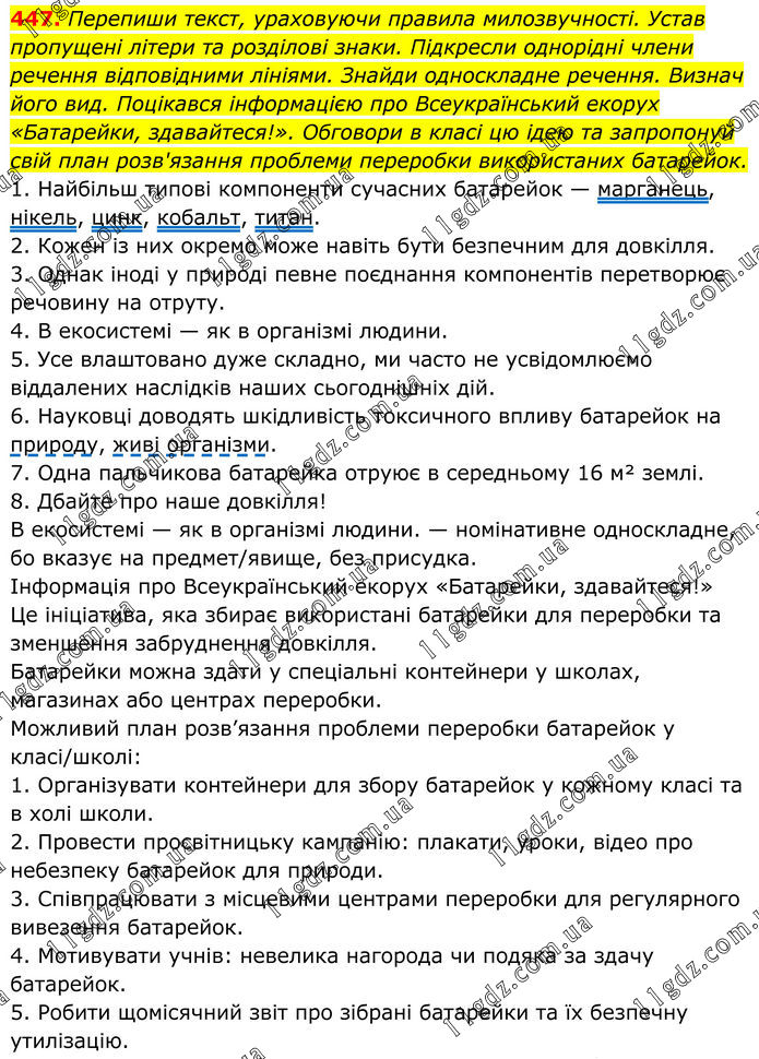 447. Перепиши текст, ураховуючи правила милозвучності. Устав пропущені літери та розділові знаки. Підкресли однорідні члени речення відповідними лініями. Знайди односкладне речення. Визнач його вид. Поцікався інформацією про Всеукраїнський екорух «Батарейки, здавайтеся!». Обговори в класі цю ідею та запропонуй свій план розв'язання проблеми переробки використаних батарейок. 1. Найбільш типові компоненти сучасних батарейок — марганець, нікель, цинк, кобальт, титан. 2. Кожен із них окремо може навіть бути безпечним для довкілля. 3. Однак іноді у природі певне поєднання компонентів перетворює речовину на отруту. 4. В екосистемі — як в організмі людини. 5. Усе влаштовано дуже складно, ми часто не усвідомлюємо віддалених наслідків наших сьогоднішніх дій. 6. Науковці доводять шкідливість токсичного впливу батарейок на природу, живі організми. 7. Одна пальчикова батарейка отруює в середньому 16 м² землі. 8. Дбайте про наше довкілля! В екосистемі — як в організмі людини. — номінативне односкладне, бо вказує на предмет/явище, без присудка. Інформація про Всеукраїнський екорух «Батарейки, здавайтеся!» Це ініціатива, яка збирає використані батарейки для переробки та зменшення забруднення довкілля. Батарейки можна здати у спеціальні контейнери у школах, магазинах або центрах переробки. Можливий план розв’язання проблеми переробки батарейок у класі/школі: 1. Організувати контейнери для збору батарейок у кожному класі та в холі школи. 2. Провести просвітницьку кампанію: плакати, уроки, відео про небезпеку батарейок для природи. 3. Співпрацювати з місцевими центрами переробки для регулярного вивезення батарейок. 4. Мотивувати учнів: невелика нагорода чи подяка за здачу батарейок. 5. Робити щомісячний звіт про зібрані батарейки та їх безпечну утилізацію.
