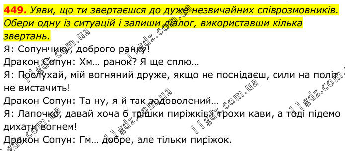 449. Уяви, що ти звертаєшся до дуже незвичайних співрозмовників. Обери одну із ситуацій і запиши діалог, використавши кілька звертань. Я: Сопунчику, доброго ранку! Дракон Сопун: Хм… ранок? Я ще сплю… Я: Послухай, мій вогняний друже, якщо не поснідаєш, сили на політ не вистачить! Дракон Сопун: Та ну, я й так задоволений… Я: Лапочко, давай хоча б трішки пиріжків і трохи кави, а тоді підемо дихати вогнем! Дракон Сопун: Гм… добре, але тільки пиріжок.