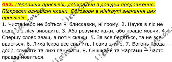 452. Перепиши прислів'я, добираючи з довідки продовження. Підкресли однорідні члени. Обговори в мінігрупі значення цих прислів'їв. 1. Чисте небо не боїться ні блискавки, ні грому. 2. Наука в ліс не веде, а з лісу виводить. 3. Або розумне кажи, або краще мовчи. 4. Спершу слово зваш, а потім скажи. 5. За все береться, та не все вдається. 6. Лиха іскра все спалить, і сама згине. 7. Вогонь і вода — добрі служити та лихі панувати. 8. Смiшками та жартами — часто правда мовиться.