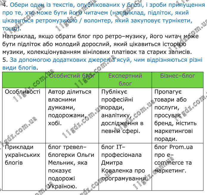 4. Обери один із текстів, опублікованих у блозі, і зроби припущення про те, хто може бути його читачем (наприклад, підліток, який цікавиться ретромузикою / волонтер, який закуповує турнікети, тощо). Наприклад, якщо обрати блог про ретро–музику, його читач може бути підліток або молодий дорослий, який цікавиться історією музики, колекціонуванням вінілових платівок та старих записів. 5. За допомогою додаткових джерел з'ясуй, чим відрізняються різні види блогів.