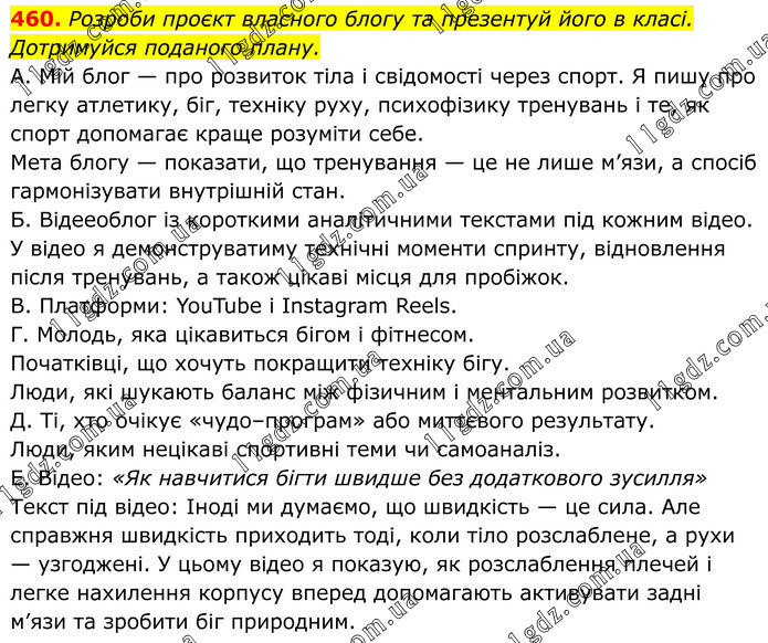 460. Розроби проєкт власного блогу та презентуй його в класі. Дотримуйся поданого плану. А. Мій блог — про розвиток тіла і свідомості через спорт. Я пишу про легку атлетику, біг, техніку руху, психофізику тренувань і те, як спорт допомагає краще розуміти себе. Мета блогу — показати, що тренування — це не лише м’язи, а спосіб гармонізувати внутрішній стан. Б. Відееоблог із короткими аналітичними текстами під кожним відео. У відео я демонструватиму технічні моменти спринту, відновлення після тренувань, а також цікаві місця для пробіжок. В. Платформи: YouTube і Instagram Reels. Г. Молодь, яка цікавиться бігом і фітнесом. Початківці, що хочуть покращити техніку бігу. Люди, які шукають баланс між фізичним і ментальним розвитком. Д. Ті, хто очікує «чудо–програм» або миттєвого результату. Люди, яким нецікаві спортивні теми чи самоаналіз. Е. Відео: «Як навчитися бігти швидше без додаткового зусилля» Текст під відео: Іноді ми думаємо, що швидкість — це сила. Але справжня швидкість приходить тоді, коли тіло розслаблене, а рухи — узгоджені. У цьому відео я показую, як розслаблення плечей і легке нахилення корпусу вперед допомагають активувати задні м’язи та зробити біг природним.
