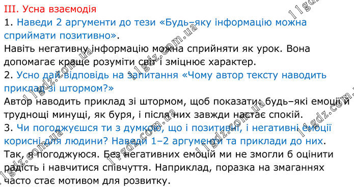 ІІІ. Усна взаємодія 1. Наведи 2 аргументи до тези «Будь–яку інформацію можна сприймати позитивно». Навіть негативну інформацію можна сприйняти як урок. Вона допомагає краще розуміти світ і зміцнює характер. 2. Усно дай відповідь на запитання «Чому автор тексту наводить приклад зі штормом?» Автор наводить приклад зі штормом, щоб показати: будь–які емоції й труднощі минущі, як буря, і після них завжди настає спокій. 3. Чи погоджуєшся ти з думкою, що і позитивні, і негативні емоції корисні для людини? Наведи 1–2 аргументи та приклади до них. Так, я погоджуюся. Без негативних емоцій ми не змогли б оцінити радість і навчитися співчуття. Наприклад, поразка на змаганнях часто стає мотивом для розвитку.