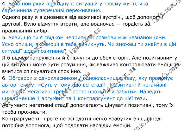 4. Усно поміркуй про одну із ситуацій у твоєму житті, яка спричинила суперечливі переживання. Одного разу я відмовився від важливої зустрічі, щоб допомогти другові. Було відчуття втрати, але водночас — гордість за правильний вибір. 5. Уяви, що ти є свідком неприємної розмови між незнайомцями. Усно опиши, які емоції в тебе виникнуть. Чи зможеш ти знайти в цій ситуації щось позитивне? Я б відчув напруження й співчуття до обох сторін. Але позитивним у цій ситуації може бути розуміння, як важливо контролювати емоції та вчитися спілкуватися спокійно. 6. Обговори з однокласником / однокласницею тезу, яку пропонує автор тексту: «Суть у тому, що всі стадії – позитивні й негативні –минають. Негативні треба просто прожити й забути». Наведіть щонайменше 1 аргумент та 1 контраргумент до цієї тези. Аргумент: негативні стадії допомагають цінувати позитивні, тому їх треба проживати. Контраргумент: проте не всі здатні легко «забути» біль, і іноді потрібна допомога, щоб подолати наслідки емоцій.