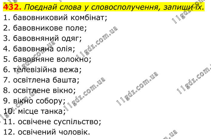 432. Поєднай слова у словосполучення, запиши їх. 1. бавовниковий комбінат; 2. бавовникове поле; 3. бавовняний одяг; 4. бавовняна олія; 5. бавовняне волокно; 6. телевізійна вежа; 7. освітлена башта; 8. освітлене вікно; 9. вікно собору; 10. місце танка; 11. освічене суспільство; 12. освічений чоловік.