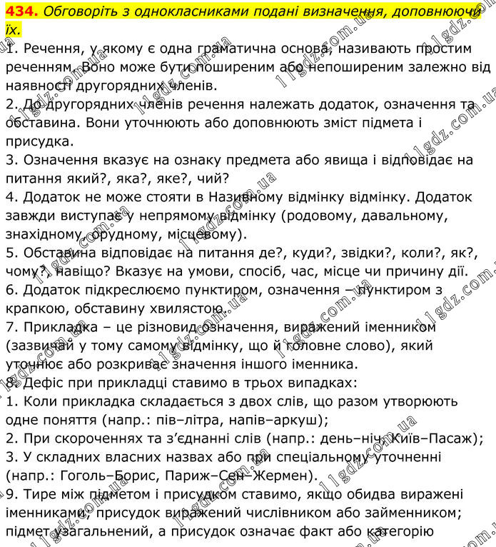 434. Обговоріть з однокласниками подані визначення, доповнюючи їх. 1. Речення, у якому є одна граматична основа, називають простим реченням. Воно може бути поширеним або непоширеним залежно від наявності другорядних членів. 2. До другорядних членів речення належать додаток, означення та обставина. Вони уточнюють або доповнюють зміст підмета і присудка. 3. Означення вказує на ознаку предмета або явища і відповідає на питання який?, яка?, яке?, чий? 4. Додаток не може стояти в Називному відмінку відмінку. Додаток завжди виступає у непрямому відмінку (родовому, давальному, знахідному, орудному, місцевому). 5. Обставина відповідає на питання де?, куди?, звідки?, коли?, як?, чому?, навіщо? Вказує на умови, спосіб, час, місце чи причину дії. 6. Додаток підкреслюємо пунктиром, означення – пунктиром з крапкою, обставину хвилястою. 7. Прикладка – це різновид означення, виражений іменником (зазвичай у тому самому відмінку, що й головне слово), який уточнює або розкриває значення іншого іменника. 8. Дефіс при прикладці ставимо в трьох випадках: 1. Коли прикладка складається з двох слів, що разом утворюють одне поняття (напр.: пів–літра, напів–аркуш); 2. При скороченнях та з’єднанні слів (напр.: день–ніч, Київ–Пасаж); 3. У складних власних назвах або при спеціальному уточненні (напр.: Гоголь–Борис, Париж–Сен–Жермен). 9. Тире між підметом і присудком ставимо, якщо обидва виражені іменниками; присудок виражений числівником або займенником; підмет узагальнений, а присудок означає факт або категорію.