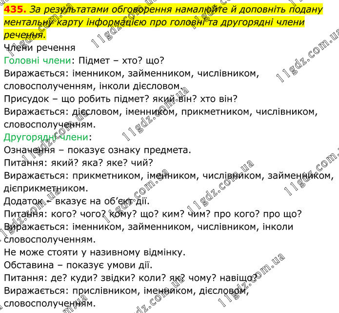 435. За результатами обговорення намалюйте й доповніть подану ментальну карту інформацією про головні та другорядні члени речення. Члени речення Головні члени: Підмет – хто? що? Виражається: іменником, займенником, числівником, словосполученням, інколи дієсловом. Присудок – що робить підмет? який він? хто він? Виражається: дієсловом, іменником, прикметником, числівником, словосполученням. Другорядні члени: Означення – показує ознаку предмета. Питання: який? яка? яке? чий? Виражається: прикметником, іменником, числівником, займенником, дієприкметником. Додаток – вказує на об’єкт дії. Питання: кого? чого? кому? що? ким? чим? про кого? про що? Виражається: іменником, займенником, числівником, інколи словосполученням. Не може стояти у називному відмінку. Обставина – показує умови дії. Питання: де? куди? звідки? коли? як? чому? навіщо? Виражається: прислівником, іменником, дієсловом, словосполученням.
