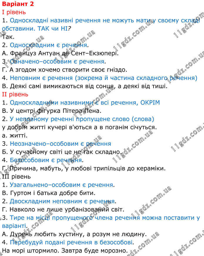 Варіант 2 І рівень 1. Односкладні називні речення не можуть мати у своєму складі обставини. ТАК чи НІ? Так. 2. Односкладним є речення. А. Француз Антуан де Сент–Екзюпері. 3. Означено–особовим є речення. Г. А згодом хочемо створити своє гніздо. 4. Неповним є речення (зокрема й частина складного речення) В. Деякі самі вимикаються від сонця, а деякі від тиші. ІІ рівень 1. Односкладними називними є всі речення, ОКРІМ В. У центрі фігурка Пітера Пена. 2. У неповному реченні пропущене слово (слова) у добрім житті кучері в'ються а в поганім січуться. а. житті. 3. Неозначено–особовим є речення Б. У сучасному світі це не так складно. 4. Безособовим є речення. Г. Причина, мабуть, у любові трипільців до кераміки. ІІІ рівень 1. Узагальнено–особовим є речення. В. Гуртом і батька добре бити. 2. Двоскладним неповним є речення. Г. Навколо не лише урбанізований світ. 3. Тире на місці пропущеного члена речення можна поставити у варіанті. А. Дурень любить хустину, а розум не людину. 4. Перебудуй подані речення в безособові. На морі штормило. Завтра буде морозно.