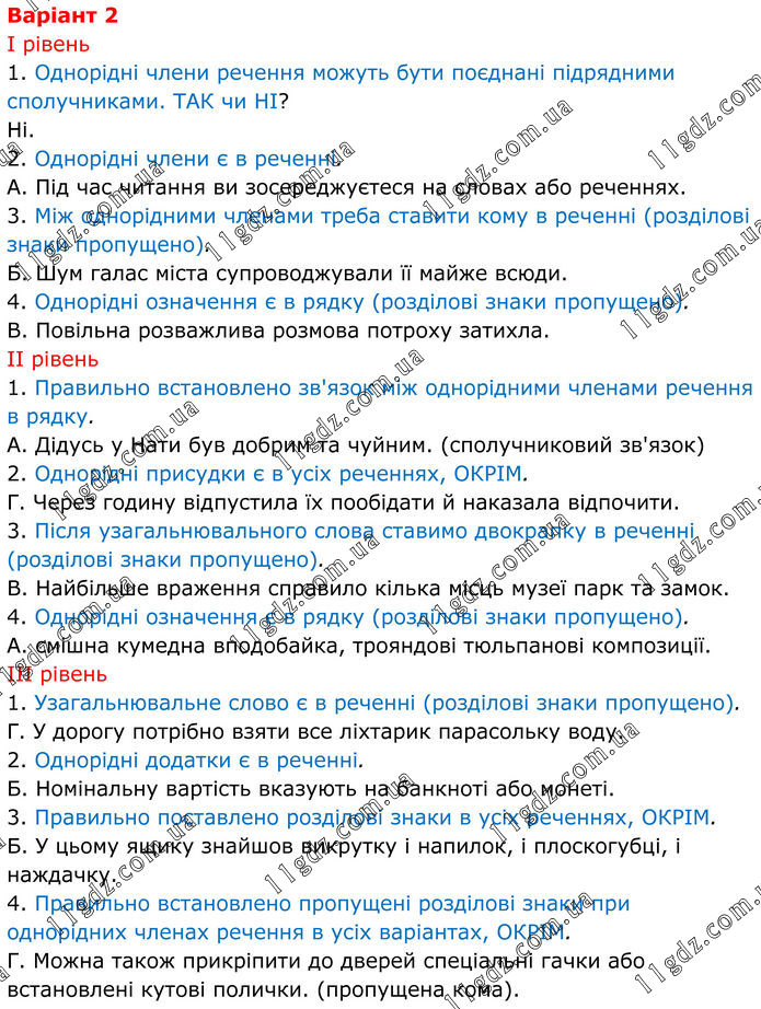 Варіант 2 І рівень 1. Однорідні члени речення можуть бути поєднані підрядними сполучниками. ТАК чи НІ? Ні. 2. Однорідні члени є в реченні. А. Під час читання ви зосереджуєтеся на словах або реченнях. 3. Між однорідними членами треба ставити кому в реченні (розділові знаки пропущено). Б. Шум галас міста супроводжували її майже всюди. 4. Однорідні означення є в рядку (розділові знаки пропущено). В. Повільна розважлива розмова потроху затихла. ІІ рівень 1. Правильно встановлено зв'язок між однорідними членами речення в рядку. А. Дідусь у Нати був добрим та чуйним. (сполучниковий зв'язок) 2. Однорідні присудки є в усіх реченнях, ОКРІМ. Г. Через годину відпустила їх пообідати й наказала відпочити. 3. Після узагальнювального слова ставимо двокрапку в реченні (розділові знаки пропущено). В. Найбільше враження справило кілька місць музеї парк та замок. 4. Однорідні означення є в рядку (розділові знаки пропущено). А. смішна кумедна вподобайка, трояндові тюльпанові композиції. ІІІ рівень 1. Узагальнювальне слово є в реченні (розділові знаки пропущено). Г. У дорогу потрібно взяти все ліхтарик парасольку воду. 2. Однорідні додатки є в реченні. Б. Номінальну вартість вказують на банкноті або монеті. 3. Правильно поставлено розділові знаки в усіх реченнях, ОКРІМ. Б. У цьому ящику знайшов викрутку і напилок, і плоскогубці, і наждачку. 4. Правильно встановлено пропущені розділові знаки при однорідних членах речення в усіх варіантах, ОКРІМ. Г. Можна також прикріпити до дверей спеціальні гачки або встановлені кутові полички. (пропущена кома).