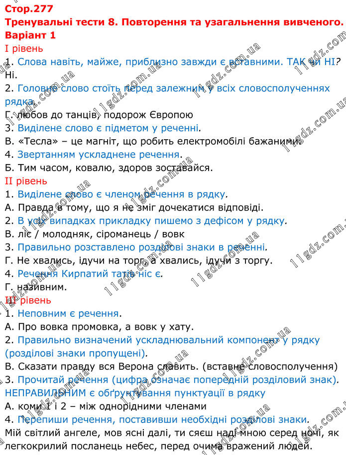 Тренувальні тести 8. Повторення та узагальнення вивченого. Варіант 1 І рівень 1. Слова навіть, майже, приблизно завжди є вставними. ТАК чи НІ? Ні. 2. Головне слово стоїть перед залежним у всіх словосполученнях рядка. Г. любов до танців, подорож Європою 3. Виділене слово є підметом у реченні. В. «Тесла» – це магніт, що робить електромобілі бажаними. 4. Звертанням ускладнене речення. Б. Тим часом, ковалю, здоров зоставайся. ІІ рівень 1. Виділене слово є членом речення в рядку. А. Правда в тому, що я не зміг дочекатися відповіді. 2. В усіх випадках прикладку пишемо з дефісом у рядку. В. ліс / молодняк, сіроманець / вовк 3. Правильно розставлено розділові знаки в реченні. Г. Не хвались, ідучи на торг, а хвались, ідучи з торгу. 4. Речення Кирпатий татів ніс є. Г. називним. ІІІ рівень 1. Неповним є речення. А. Про вовка промовка, а вовк у хату. 2. Правильно визначений ускладнювальний компонент у рядку (розділові знаки пропущені). В. Сказати правду вся Верона славить. (вставне словосполучення) 3. Прочитай речення (цифра означає попередній розділовий знак). НЕПРАВИЛЬНИМ є обґрунтування пунктуації в рядку А. коми 1 і 2 – між однорідними членами 4. Перепиши речення, поставивши необхідні розділові знаки. Мій світлий ангеле, мов ясні далі, ти сяєш наді мною серед ночі, як легкокрилий посланець небес, перед очима вражений людей.