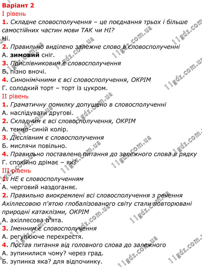 Варіант 2 І рівень 1. Складне словосполучення – це поєднання трьох і більше самостійних частин мови ТАК чи НІ? Ні. 2. Правильно виділено залежне слово в словосполученні А. зимовий сніг. 3. Прислівниковим є словосполучення Б. пізно вночі. 4. Синонімічними є всі словосполучення, ОКРІМ Г. солодкий торт – торт із цукром. ІІ рівень 1. Граматичну помилку допущено в словосполученні А. наслідувати другові. 2. Складним є всі словосполучення, ОКРІМ А. темно–синій колір. 3. Дієслівним є словосполучення Б. мислячи повільно. 4. Правильно поставлене питання до залежного слова в рядку Г. спокійно дрімає – як? ІІІ рівень 1. НЕ є словосполученням А. черговий наздоганяє. 2. Правильно виокремлені всі словосполучення з речення Ахіллесовою п'ятою глобалізованого світу стали повторювані природні катаклізми, ОКРІМ А. ахіллесова п'ята. 3. Іменним є словосполучення А. регулююче перехрестя. 4. Постав питання від головного слова до залежного А. зупинилися чому? через град. Б. зупинка яка? для відпочинку.