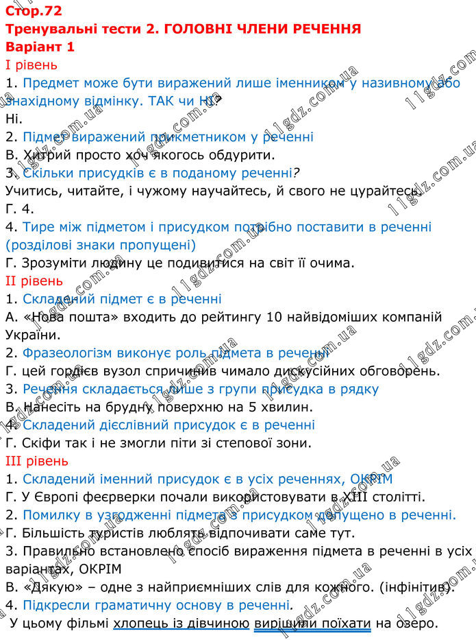 Стор.72 Тренувальні тести 2. ГОЛОВНІ ЧЛЕНИ РЕЧЕННЯ Варіант 1 І рівень 1. Предмет може бути виражений лише іменником у називному або знахідному відмінку. ТАК чи НІ? Ні. 2. Підмет виражений прикметником у реченні В. Хитрий просто хоч якогось обдурити. 3. Скільки присудків є в поданому реченні? Учитись, читайте, і чужому научайтесь, й свого не цурайтесь. Г. 4. 4. Тире між підметом і присудком потрібно поставити в реченні (розділові знаки пропущені) Г. Зрозуміти людину це подивитися на світ її очима. ІІ рівень 1. Складений підмет є в реченні А. «Нова пошта» входить до рейтингу 10 найвідоміших компаній України. 2. Фразеологізм виконує роль підмета в реченні Г. цей гордієв вузол спричинив чимало дискусійних обговорень. 3. Речення складається лише з групи присудка в рядку В. Нанесіть на брудну поверхню на 5 хвилин. 4. Складений дієслівний присудок є в реченні Г. Скіфи так і не змогли піти зі степової зони. ІІІ рівень 1. Складений іменний присудок є в усіх реченнях, ОКРІМ Г. У Європі феєрверки почали використовувати в XІII столітті. 2. Помилку в узгодженні підмета з присудком допущено в реченні. Г. Більшість туристів люблять відпочивати саме тут. 3. Правильно встановлено спосіб вираження підмета в реченні в усіх варіантах, ОКРІМ В. «Дякую» – одне з найприємніших слів для кожного. (інфінітив). 4. Підкресли граматичну основу в реченні. У цьому фільмі хлопець із дівчиною вирішили поїхати на озеро.