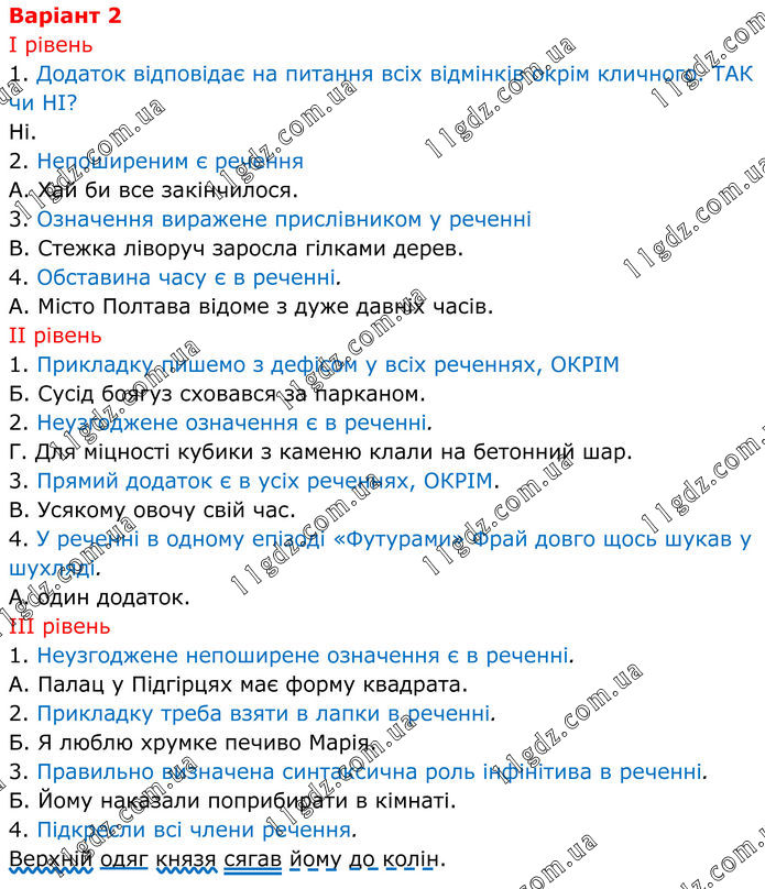 Варіант 2 І рівень 1. Додаток відповідає на питання всіх відмінків окрім кличного. ТАК чи НІ? Ні. 2. Непоширеним є речення А. Хай би все закінчилося. 3. Означення виражене прислівником у реченні В. Стежка ліворуч заросла гілками дерев. 4. Обставина часу є в реченні. А. Місто Полтава відоме з дуже давніх часів. ІІ рівень 1. Прикладку пишемо з дефісом у всіх реченнях, ОКРІМ Б. Сусід боягуз сховався за парканом. 2. Неузгоджене означення є в реченні. Г. Для міцності кубики з каменю клали на бетонний шар. 3. Прямий додаток є в усіх реченнях, ОКРІМ. В. Усякому овочу свій час. 4. У реченні в одному епізоді «Футурами» Фрай довго щось шукав у шухляді. А. один додаток. ІІІ рівень 1. Неузгоджене непоширене означення є в реченні. А. Палац у Підгірцях має форму квадрата. 2. Прикладку треба взяти в лапки в реченні. Б. Я люблю хрумке печиво Марія. 3. Правильно визначена синтаксична роль інфінітива в реченні. Б. Йому наказали поприбирати в кімнаті. 4. Підкресли всі члени речення. Верхній одяг князя сягав йому до колін.
