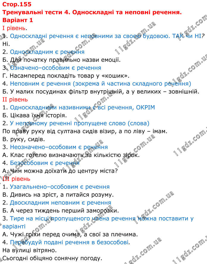 Тренувальні тести 4. Односкладні та неповні речення. Варіант 1 І рівень. 1. Односкладні речення є неповними за своєю будовою. ТАК чи НІ? Ні. 2. Односкладним є речення Б. Для початку правильно назви емоції. 3. Означено–особовим є речення Г. Насамперед покладіть товар у «кошик». 4. Неповним є речення (зокрема й частина складного речення) Б. У малих посудинах фільтр внутрішній, а у великих – зовнішній. ІІ рівень 1. Односкладними називними є всі речення, ОКРІМ Б. Цікава їхня історія. 2. У неповному реченні пропущене слово (слова) По праву руку від султана сидів візир, а по ліву – імам. В. руку, сидів. 3. Неозначено–особовим є речення А. Клас готелю визначають за кількістю зірок. 4. Безособовим є речення А. Чим можна доїхати до центру міста? ІІІ рівень 1. Узагальнено–особовим є речення В. Дивись на зріст, а питайся розуму. 2. Двоскладним неповним є речення Б. А через тиждень перший заморозки. 3. Тире на місці пропущеного члена речення можна поставити у варіанті А. Чужі гріхи перед очима, а свої за плечима. 4. Перебудуй подані речення в безособові. На вулиці вітряно. Сьогодні обіцяно сонячну погоду.