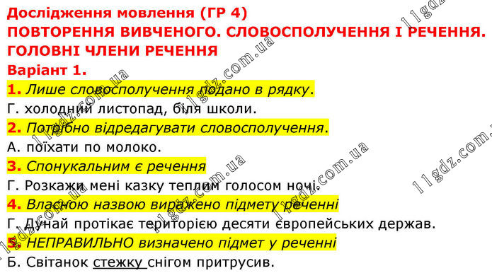 Дослідження мовлення (ГР 4) ПОВТОРЕННЯ ВИВЧЕНОГО. СЛОВОСПОЛУЧЕННЯ І РЕЧЕННЯ. ГОЛОВНІ ЧЛЕНИ РЕЧЕННЯ Варіант 1. 1. Лише словосполучення подано в рядку. Г. холодний листопад, біля школи. 2. Потрібно відредагувати словосполучення. А. поїхати по молоко. 3. Спонукальним є речення Г. Розкажи мені казку теплим голосом ночі. 4. Власною назвою виражено підмету реченні Г. Дунай протікає територією десяти європейських держав. 5. НЕПРАВИЛЬНО визначено підмет у реченні Б. Світанок стежку снігом притрусив.