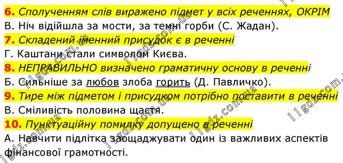 6. Сполученням слів виражено підмет у всіх реченнях, ОКРІМ В. Ніч відійшла за мости, за темні горби (С. Жадан). 7. Складений іменний присудок є в реченні Г. Каштани стали символом Києва. 8. НЕПРАВИЛЬНО визначено граматичну основу в реченні Б. Сильніше за любов злоба горить (Д. Павличко). 9. Тире між підметом і присудком потрібно поставити в реченні В. Сміливість половина щастя. 10. Пунктуаційну помилку допущено в реченні А. Навчити підлітка заощаджувати один із важливих аспектів фінансової грамотності.