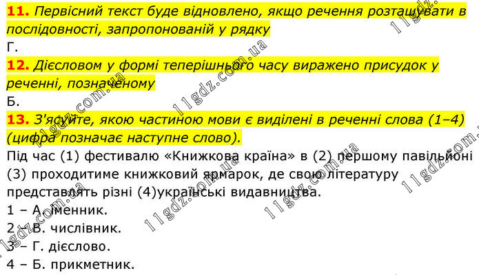 11. Первісний текст буде відновлено, якщо речення розташувати в послідовності, запропонованій у рядку Г. 12. Дієсловом у формі теперішнього часу виражено присудок у реченні, позначеному Б. 13. З'ясуйте, якою частиною мови є виділені в реченні слова (1–4) (цифра позначає наступне слово). Під час (1) фестивалю «Книжкова країна» в (2) першому павільйоні (3) проходитиме книжковий ярмарок, де свою літературу представлять різні (4)українські видавництва. 1 – А. іменник. 2 – В. числівник. 3 – Г. дієслово. 4 – Б. прикметник.