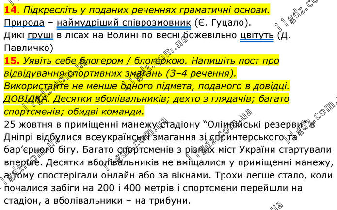 14. Підкресліть у поданих реченнях граматичні основи. Природа – наймудріший співрозмовник (Є. Гуцало). Дикі груші в лісах на Волині по весні божевільно цвітуть (Д. Павличко) 15. Уявіть себе блогером / блогеркою. Напишіть пост про відвідування спортивних змагань (3–4 речення). Використайте не менше одного підмета, поданого в довідці. ДОВІДКА. Десятки вболівальників; дехто з глядачів; багато спортсменів; обидві команди. 25 жовтня в приміщенні манежу стадіону “Олімпійські резерви” в Дніпрі відбулися всеукраїнські змагання зі спринтерського та бар’єрного бігу. Багато спортсменів з різних міст України стартували вперше. Десятки вболівальників не вміщалися у приміщенні манежу, а тому спостерігали онлайн або за вікнами. Трохи легше стало, коли почалися забіги на 200 і 400 метрів і спортсмени перейшли на стадіон, а вболівальники – на трибуни.