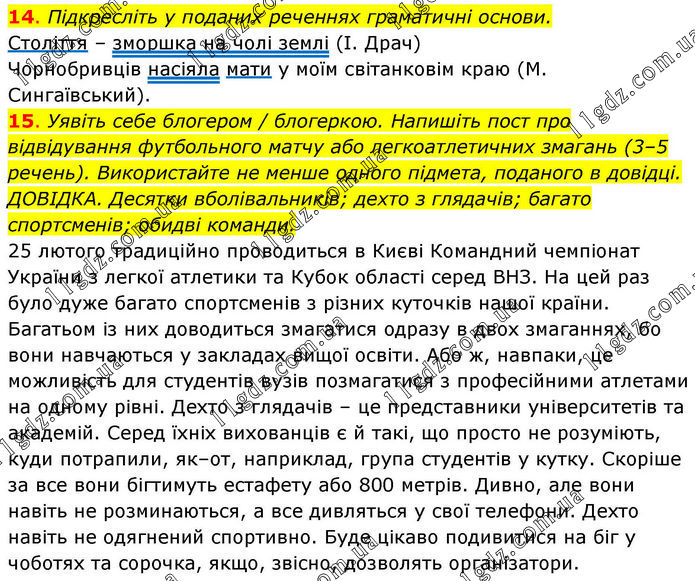 14. Підкресліть у поданих реченнях граматичні основи. Століття – зморшка на чолі землі (І. Драч) Чорнобривців насіяла мати у моїм світанковім краю (М. Сингаївський). 15. Уявіть себе блогером / блогеркою. Напишіть пост про відвідування футбольного матчу або легкоатлетичних змагань (3–5 речень). Використайте не менше одного підмета, поданого в довідці. ДОВІДКА. Десятки вболівальників; дехто з глядачів; багато спортсменів; обидві команди. 25 лютого традиційно проводиться в Києві Командний чемпіонат України з легкої атлетики та Кубок області серед ВНЗ. На цей раз було дуже багато спортсменів з різних куточків нашої країни. Багатьом із них доводиться змагатися одразу в двох змаганнях, бо вони навчаються у закладах вищої освіти. Або ж, навпаки, це можливість для студентів вузів позмагатися з професійними атлетами на одному рівні. Дехто з глядачів – це представники університетів та академій. Серед їхніх вихованців є й такі, що просто не розуміють, куди потрапили, як–от, наприклад, група студентів у кутку. Скоріше за все вони бігтимуть естафету або 800 метрів. Дивно, але вони навіть не розминаються, а все дивляться у свої телефони. Дехто навіть не одягнений спортивно. Буде цікаво подивитися на біг у чоботях та сорочка, якщо, звісно, дозволять організатори.
