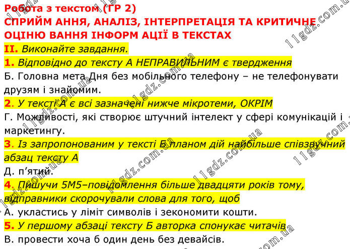 Робота з текстом (ГР 2) СПРИЙМАННЯ, АНАЛІЗ, ІНТЕРПРЕТАЦІЯ ТА КРИТИЧНЕ ОЦІНЮ ВАННЯ ІНФОРМ АЦІЇ В ТЕКСТАХ II. Виконайте завдання. 1. Відповідно до тексту А НЕПРАВИЛЬНИМ є твердження Б. Головна мета Дня без мобільного телефону – не телефонувати друзям і знайомим. 2. У тексті А є всі зазначені нижче мікротеми, ОКРІМ Г. Можливості, які створює штучний інтелект у сфері комунікацій і маркетингу. 3. Із запропонованим у тексті Б планом дій найбільше співзвучний абзац тексту А Д. п’ятий. 4. Пишучи 5М5–повідомлення більше двадцяти років тому, відправники скорочували слова для того, щоб А. укластись у ліміт символів і зекономити кошти. 5. У першому абзаці тексту Б авторка спонукає читачів В. провести хоча б один день без девайсів.