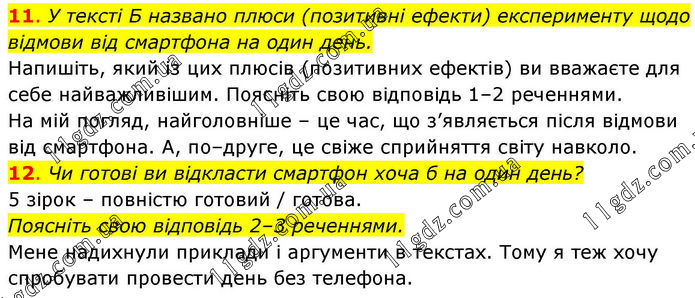 11. У тексті Б названо плюси (позитивні ефекти) експерименту щодо відмови від смартфона на один день. Напишіть, який із цих плюсів (позитивних ефектів) ви вважаєте для себе найважливішим. Поясніть свою відповідь 1–2 реченнями. На мій погляд, найголовніше – це час, що з’являється після відмови від смартфона. А, по–друге, це свіже сприйняття світу навколо. 12. Чи готові ви відкласти смартфон хоча б на один день? 5 зірок – повністю готовий / готова. Поясніть свою відповідь 2–3 реченнями. Мене надихнули приклади і аргументи в текстах. Тому я теж хочу спробувати провести день без телефона.