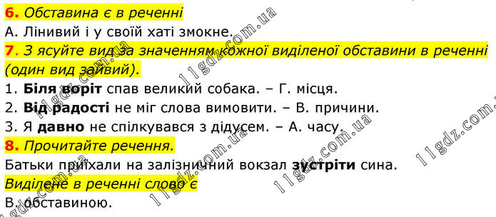 6. Обставина є в реченні А. Лінивий і у своїй хаті змокне. 7. З ясуйте вид за значенням кожної виділеної обставини в реченні (один вид зайвий). 1. Біля воріт спав великий собака. – Г. місця. 2. Від радості не міг слова вимовити. – В. причини. 3. Я давно не спілкувався з дідусем. – А. часу. 8. Прочитайте речення. Батьки приїхали на залізничний вокзал зустріти сина. Виділене в реченні слово є В. обставиною.