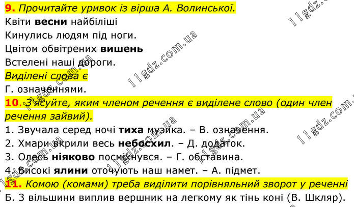 9. Прочитайте уривок із вірша А. Волинської. Квіти весни найбіліші Кинулись людям під ноги. Цвітом обвітрених вишень Встелені наші дороги. Виділені слова є Г. означеннями. 10. З'ясуйте, яким членом речення є виділене слово (один член речення зайвий). 1. Звучала серед ночі тиха музика. – В. означення. 2. Хмари вкрили весь небосхил. – Д. додаток. 3. Олесь ніяково посміхнувся. – Г. обставина. 4. Високі ялини оточують наш намет. – А. підмет. 11. Комою (комами) треба виділити порівняльний зворот у реченні Б. 3 вільшини виплив вершник на легкому як тінь коні (В. Шкляр).