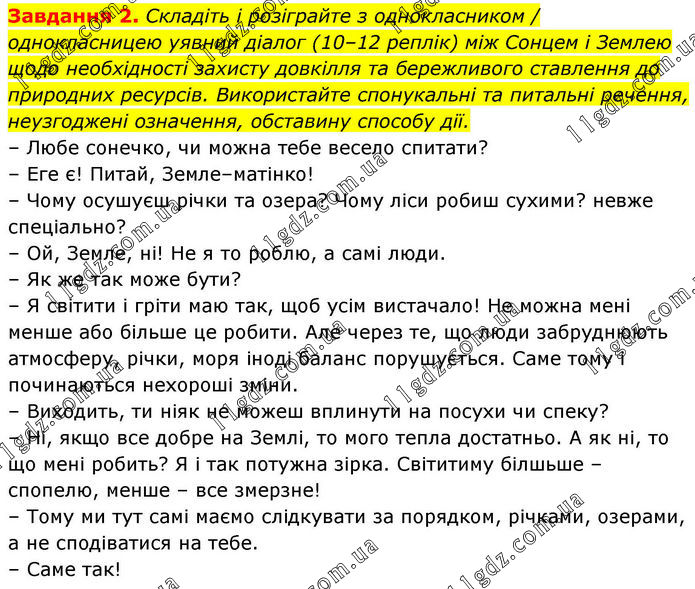 Завдання 2. Складіть і розіграйте з однокласником / однокласницею уявний діалог (10–12 реплік) між Сонцем і Землею щодо необхідності захисту довкілля та бережливого ставлення до природних ресурсів. Використайте спонукальні та питальні речення, неузгоджені означення, обставину способу дії. – Любе сонечко, чи можна тебе весело спитати? – Еге є! Питай, Земле–матінко! – Чому осушуєш річки та озера? Чому ліси робиш сухими? невже спеціально? – Ой, Земле, ні! Не я то роблю, а самі люди. – Як же так може бути? – Я світити і гріти маю так, щоб усім вистачало! Не можна мені менше або більше це робити. Але через те, що люди забруднюють атмосферу, річки, моря іноді баланс порушується. Саме тому і починаються нехороші зміни. – Виходить, ти ніяк не можеш вплинути на посухи чи спеку? – Ні, якщо все добре на Землі, то мого тепла достатньо. А як ні, то що мені робить? Я і так потужна зірка. Світитиму білшьше – спопелю, менше – все змерзне! – Тому ми тут самі маємо слідкувати за порядком, річками, озерами, а не сподіватися на тебе. – Саме так!