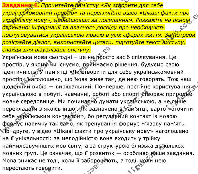 Завдання 4. Прочитайте пам'ятку «Як створити для себе українськомовний простір» та перегляньте відео «Цікаві факти про українську мову», перейшовши за посиланням. Розкажіть на основі отриманої інформації та власного досвіду про необхідність послуговуватися українською мовою в усіх сферах життя. За потреби розіграйте діалог, використайте цитати, підготуйте текст виступу, слайди для візуалізації виступу. Українська мова сьогодні – це не просто засіб спілкування. Це простір, у якому ми існуємо, приймаємо рішення, будуємо свою ідентичність. У пам’ятці «Як створити для себе українськомовний простір» наголошено, що мова живе там, де нею говорять. Тож наш щоденний вибір — вирішальний. По–перше, постійне користування українською в побуті, навчанні, роботі або спорті створює природне мовне середовище. Ми починаємо думати українською, а не лише перекладати з якоїсь іншої. Як зазначено в пам’ятці, варто «оточити себе українським контентом», бо регулярний контакт із мовою формує навичку так само, як тренування формує м’язову пам’ять. По–друге, у відео «Цікаві факти про українську мову» наголошено на її унікальності: за мелодійністю вона входить у трійку наймилозвучніших мов світу, а за структурою близька до кількох мовних груп. Це означає, що її розвиток — особливо наше завдання. Мова зникає не тоді, коли її забороняють, а тоді, коли нею перестають говорити.
