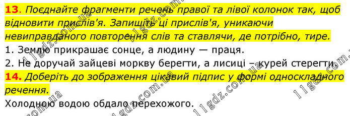 13. Поєднайте фрагменти речень правої та лівої колонок так, щоб відновити прислів'я. Запишіть ці прислів'я, уникаючи невиправданого повторення слів та ставлячи, де потрібно, тире. 1. Землю прикрашає сонце, а людину — праця. 2. Не доручай зайцеві моркву берегти, а лисиці – курей стерегти. 14. Доберіть до зображення цікавий підпис у формі односкладного речення. Холодною водою обдало перехожого.