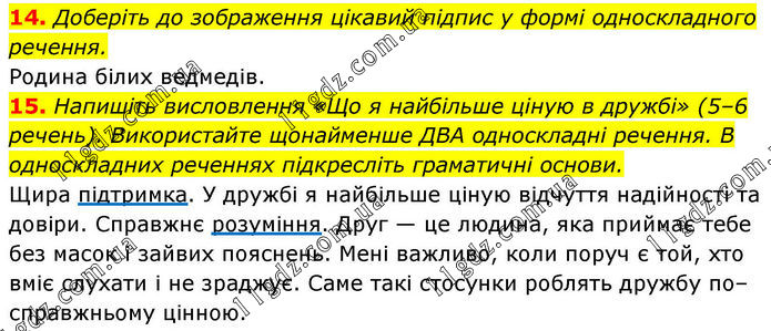 14. Доберіть до зображення цікавий підпис у формі односкладного речення. Родина білих ведмедів. 15. Напишіть висловлення «Що я найбільше ціную в дружбі» (5–6 речень). Використайте щонайменше ДВА односкладні речення. В односкладних реченнях підкресліть граматичні основи. Щира підтримка. У дружбі я найбільше ціную відчуття надійності та довіри. Справжнє розуміння. Друг — це людина, яка приймає тебе без масок і зайвих пояснень. Мені важливо, коли поруч є той, хто вміє слухати і не зраджує. Саме такі стосунки роблять дружбу по–справжньому цінною.