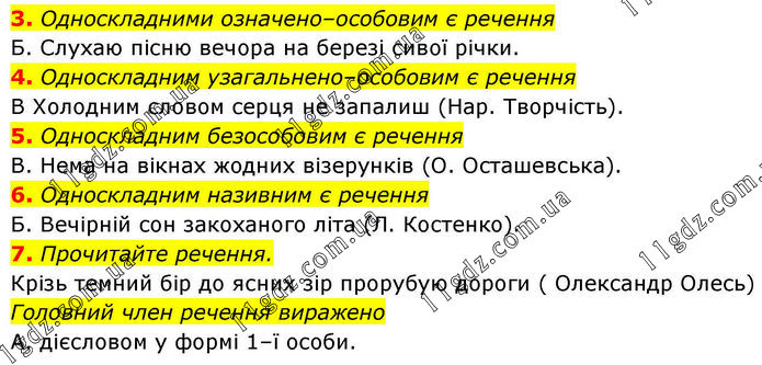 3. Односкладними означено–особовим є речення Б. Слухаю пісню вечора на березі сивої річки. 4. Односкладним узагальнено–особовим є речення В Холодним словом серця не запалиш (Нар. Творчість). 5. Односкладним безособовим є речення В. Нема на вікнах жодних візерунків (О. Осташевська). 6. Односкладним називним є речення Б. Вечірній сон закоханого літа (Л. Костенко). 7. Прочитайте речення. Крізь темний бір до ясних зір прорубую дороги (Олександр Олесь) Головний член речення виражено А. дієсловом у формі 1–ї особи.