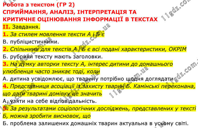 Робота з текстом (ГР 2) СПРИЙМАННЯ, АНАЛІЗ, ІНТЕРПРЕТАЦІЯ ТА КРИТИЧНЕ ОЦІНЮВАННЯ ІНФОРМАЦІЇ В ТЕКСТАХ II. Завдання. 1. За стилем мовлення тексти А і Б є В. публіцистичними. 2. Спільними для текстів А і Б є всі подані характеристики, ОКРІМ Б. рубрики тексту мають заголовки. 3. На думку авторки тексту А, інтерес дитини до домашнього улюбленця часто зникає тоді, коли А. дитина усвідомлює, що тварину потрібно щодня доглядати 4. Представниця асоціації із захисту тварин Б. Камінські переконана, що дати тварині домівку це значить А. узяти на себе відповідальність. 5. За результатами соціологічних досліджень, представлених у тексті Б, можна зробити висновок, що Б. проблема залишених домашніх тварин актуальна в усьому світі.