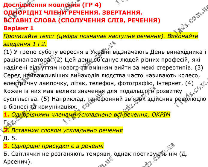 Дослідження мовлення (ГР 4) ОДНОРІДНІ ЧЛЕНИ РЕЧЕННЯ. ЗВЕРТАННЯ. ВСТАВНІ СЛОВА (СПОЛУЧЕННЯ СЛІВ, РЕЧЕННЯ) Варіант 1 Прочитайте текст (цифра позначає наступне речення). Виконайте завдання 1 і 2. (1) У третю суботу вересня в Україні відзначають День винахідника і раціоналізатора. (2) Цей день об’єднує людей різних професій, які наділені відчуттям нового та вмінням вийти за межі стереотипів. (3) Серед найважливіших винаходів людства часто називають колесо, електричну лампочку, літак, телефон, фотографію, інтернет. (4) Кожен із них мав велике значення для подальшого розвитку суспільства. (5) Наприклад, телефонний зв’язок здійснив революцію в бізнесі та комунікаціях. 1. Однорідними членами ускладнено всі речення, ОКРІМ Г. 4. 2. Вставним словом ускладнено речення Д. 5. 3. Однорідні присудки є в реченні Б. Світлячки не розганяють темряви, однак поетизують ніч (Д. Арсенич).