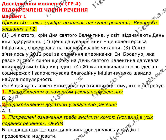 Дослідження мовлення (ГР 4) ВІДОКРЕМЛЕНІ ЧЛЕНИ РЕЧЕННЯ Варіант 1 Прочитайте текст (цифра позначає наступне речення). Виконайте завдання 1 і 2. (1) 14 лютого, крім Дня святого Валентина, у світі відзначають День книгодарування. (2) День дарування книг – це волонтерська ініціатива, спрямована на популяризацію читання. (3) Свято з’явилось у 2012 році за сприяння американки Емі Бродмур, яка разом зі своїм сином щороку на День святого Валентина дарувала книжки дітям із бідних родин. (4) Жінка поділилася своєю ідеєю в соцмережах і започаткувала благодійну ініціативу, яка швидко набула популярності. (5) У цей день кожен може подарувати книжку тому, хто її потребує. 1. Відокремленим означенням ускладнено речення Б. 2. 2. Відокремленим додатком ускладнено речення А. 1. 3. Підкреслені означення треба виділити комою (комами) в усіх поданих реченнях, ОКРІМ Б. сповнена сил і завзяття дівчина повернулась у студію і продовжила малювати.