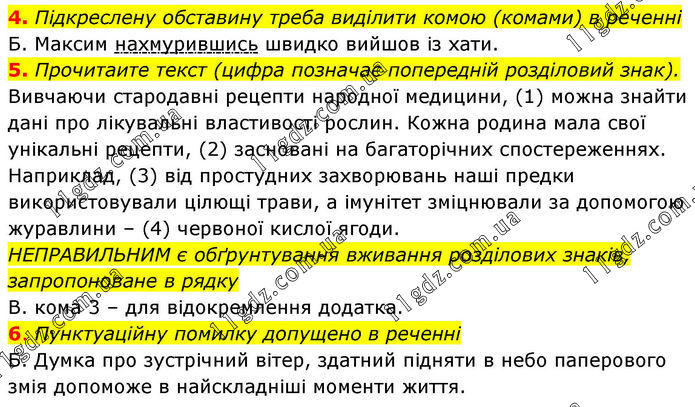 4. Підкреслену обставину треба виділити комою (комами) в реченні Б. Максим нахмурившись швидко вийшов із хати. 5. Прочитаите текст (цифра позначає попередній розділовий знак). Вивчаючи стародавні рецепти народної медицини, (1) можна знайти дані про лікувальні властивості рослин. Кожна родина мала свої унікальні рецепти, (2) засновані на багаторічних спостереженнях. Наприклад, (3) від простудних захворювань наші предки використовували цілющі трави, а імунітет зміцнювали за допомогою журавлини – (4) червоної кислої ягоди. НЕПРАВИЛЬНИМ є обґрунтування вживання розділових знаків, запропоноване в рядку В. кома 3 – для відокремлення додатка. 6. Пунктуаційну помилку допущено в реченні Б. Думка про зустрічний вітер, здатний підняти в небо паперового змія допоможе в найскладніші моменти життя.