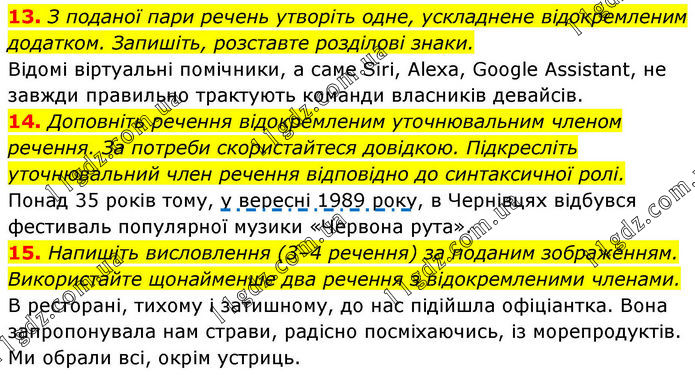 13. З поданої пари речень утворіть одне, ускладнене відокремленим додатком. Запишіть, розставте розділові знаки. Відомі віртуальні помічники, а саме Siri, Аlexa, Google Assistant, не завжди правильно трактують команди власників девайсів. 14. Доповніть речення відокремленим уточнювальним членом речення. За потреби скористайтеся довідкою. Підкресліть уточнювальний член речення відповідно до синтаксичної ролі. Понад 35 років тому, у вересні 1989 року, в Чернівцях відбувся фестиваль популярної музики «Червона рута». 15. Напишіть висловлення (3–4 речення) за поданим зображенням. Використайте щонайменше два речення з відокремленими членами. В ресторані, тихому і затишному, до нас підійшла офіціантка. Вона запропонувала нам страви, радісно посміхаючись, із морепродуктів. Ми обрали всі, окрім устриць.