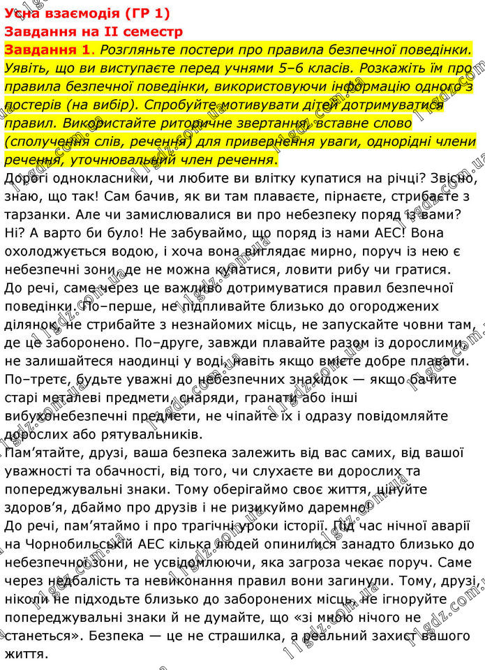 Усна взаємодія (ГР 1) Завдання на II семестр Завдання 1. Розгляньте постери про правила безпечної поведінки. Уявіть, що ви виступаєте перед учнями 5–6 класів. Розкажіть їм про правила безпечної поведінки, використовуючи інформацію одного з постерів (на вибір). Спробуйте мотивувати дітей дотримуватися правил. Використайте риторичне звертання, вставне слово (сполучення слів, речення) для привернення уваги, однорідні члени речення, уточнювальний член речення. Дорогі однокласники, чи любите ви влітку купатися на річці? Звісно, знаю, що так! Сам бачив, як ви там плаваєте, пірнаєте, стрибаєте з тарзанки. Але чи замислювалися ви про небезпеку поряд із вами? Ні? А варто би було! Не забуваймо, що поряд із нами АЕС! Вона охолоджується водою, і хоча вона виглядає мирно, поруч із нею є небезпечні зони, де не можна купатися, ловити рибу чи гратися. До речі, саме через це важливо дотримуватися правил безпечної поведінки. По–перше, не підпливайте близько до огороджених ділянок, не стрибайте з незнайомих місць, не запускайте човни там, де це заборонено. По–друге, завжди плавайте разом із дорослими, не залишайтеся наодинці у воді, навіть якщо вмієте добре плавати. По–третє, будьте уважні до небезпечних знахідок — якщо бачите старі металеві предмети, снаряди, гранати або інші вибухонебезпечні предмети, не чіпайте їх і одразу повідомляйте дорослих або рятувальників. Пам’ятайте, друзі, ваша безпека залежить від вас самих, від вашої уважності та обачності, від того, чи слухаєте ви дорослих та попереджувальні знаки. Тому оберігаймо своє життя, цінуйте здоров’я, дбаймо про друзів і не ризикуймо даремно! До речі, пам’ятаймо і про трагічні уроки історії. Під час нічної аварії на Чорнобильській АЕС кілька людей опинилися занадто близько до небезпечної зони, не усвідомлюючи, яка загроза чекає поруч. Саме через недбалість та невиконання правил вони загинули. Тому, друзі, ніколи не підходьте близько до заборонених місць, не ігноруйте попереджувальні знаки й не думайте, що «зі мною нічого не станеться». Безпека — це не страшилка, а реальний захист вашого життя.