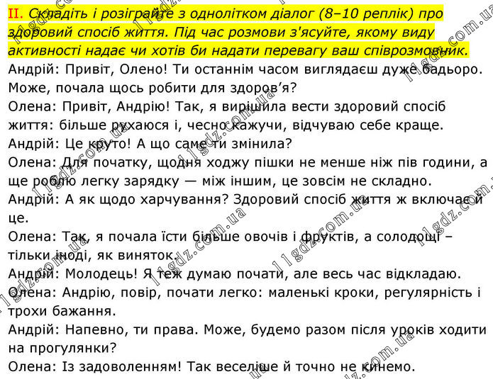 II. Складіть і розіграйте з однолітком діалог (8–10 реплік) про здоровий спосіб життя. Під час розмови з'ясуйте, якому виду активності надає чи хотів би надати перевагу ваш співрозмовник. Андрій: Привіт, Олено! Ти останнім часом виглядаєш дуже бадьоро. Може, почала щось робити для здоров’я? Олена: Привіт, Андрію! Так, я вирішила вести здоровий спосіб життя: більше рухаюся і, чесно кажучи, відчуваю себе краще. Андрій: Це круто! А що саме ти змінила? Олена: Для початку, щодня ходжу пішки не менше ніж пів години, а ще роблю легку зарядку — між іншим, це зовсім не складно. Андрій: А як щодо харчування? Здоровий спосіб життя ж включає й це. Олена: Так, я почала їсти більше овочів і фруктів, а солодощі – тільки іноді, як виняток. Андрій: Молодець! Я теж думаю почати, але весь час відкладаю. Олена: Андрію, повір, почати легко: маленькі кроки, регулярність і трохи бажання. Андрій: Напевно, ти права. Може, будемо разом після уроків ходити на прогулянки? Олена: Із задоволенням! Так веселіше й точно не кинемо.