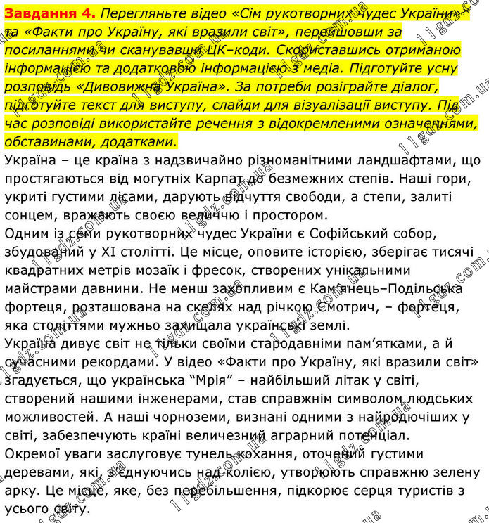 Завдання 4. Перегляньте відео «Сім рукотворних чудес України»* та «Факти про Україну, які вразили світ», перейшовши за посиланнями чи сканувавши ЦК–коди. Скориставшись отриманою інформацією та додатковою інформацією з медіа. Підготуйте усну розповідь «Дивовижна Україна». За потреби розіграйте діалог, підготуйте текст для виступу, слайди для візуалізації виступу. Під час розповіді використайте речення з відокремленими означеннями, обставинами, додатками. Україна – це країна з надзвичайно різноманітними ландшафтами, що простягаються від могутніх Карпат до безмежних степів. Наші гори, укриті густими лісами, дарують відчуття свободи, а степи, залиті сонцем, вражають своєю величчю і простором. Одним із семи рукотворних чудес України є Софійський собор, збудований у XI столітті. Це місце, оповите історією, зберігає тисячі квадратних метрів мозаїк і фресок, створених унікальними майстрами давнини. Не менш захопливим є Кам’янець–Подільська фортеця, розташована на скелях над річкою Смотрич, – фортеця, яка століттями мужньо захищала українські землі. Україна дивує світ не тільки своїми стародавніми пам’ятками, а й сучасними рекордами. У відео «Факти про Україну, які вразили світ» згадується, що українська “Мрія” – найбільший літак у світі, створений нашими інженерами, став справжнім символом людських можливостей. А наші чорноземи, визнані одними з найродючіших у світі, забезпечують країні величезний аграрний потенціал. Окремої уваги заслуговує тунель кохання, оточений густими деревами, які, з’єднуючись над колією, утворюють справжню зелену арку. Це місце, яке, без перебільшення, підкорює серця туристів з усього світу.