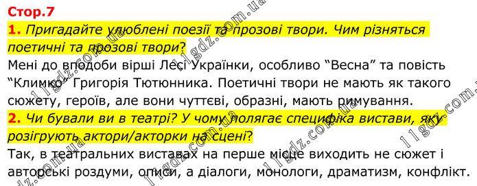 1. Пригадайте улюблені поезії та прозові твори. Чим різняться поетичні та прозові твори? Мені до вподоби вірші Лесі Українки, особливо “Весна” та повість “Климко” Григорія Тютюнника. Поетичні твори не мають як такого сюжету, героїв, але вони чуттєві, образні, мають римування. 2. Чи бували ви в театрі? У чому полягає специфіка вистави, яку розігрують актори/акторки на сцені? Так, в театральних виставах на перше місце виходить не сюжет і авторські роздуми, описи, а діалоги, монологи, драматизм, конфлікт.
