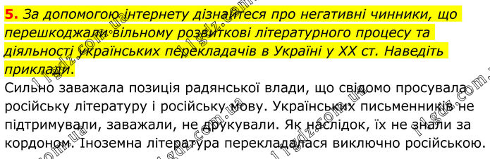 За допомогою інтернету дізнайтеся про негативні чинники, що перешкоджали вільному розвиткові літературного процесу та діяльності українських перекладачів в Україні у ХХ ст. Наведіть приклади. Сильно заважала позиція радянської влади, що свідомо просувала російську літературу і російську мову. Українських письменників не підтримували, заважали, не друкували. Як наслідок, їх не знали за кордоном. Іноземна література перекладалася виключно російською.