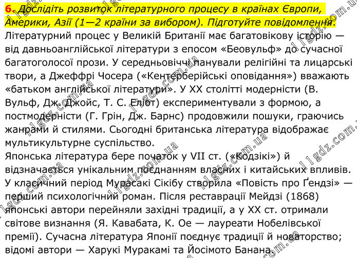 Дослідіть розвиток літературного процесу в країнах Європи, Америки, Азії (1—2 країни за вибором). Підготуйте повідомлення. Літературний процес у Великій Британії має багатовікову історію — від давньоанглійської літератури з епосом «Беовульф» до сучасної багатоголосої прози. У середньовіччі панували релігійні та лицарські твори, а Джеффрі Чосера («Кентерберійські оповідання») вважають «батьком англійської літератури». У XX столітті модерністи (В. Вульф, Дж. Джойс, Т. С. Еліот) експериментували з формою, а постмодерністи (Г. Грін, Дж. Барнс) продовжили пошуки, граючись жанрами й стилями. Сьогодні британська література відображає мультикультурне суспільство. Японська література бере початок у VII ст. («Кодзікі») й відзначається унікальним поєднанням власних і китайських впливів. У класичний період Мурасакі Сікібу створила «Повість про Ґендзі» — перший психологічний роман. Після реставрації Мейдзі (1868) японські автори перейняли західні традиції, а у XX ст. отримали світове визнання (Я. Кавабата, К. Ое — лауреати Нобелівської премії). Сучасна література Японії поєднує традиції й новаторство; відомі автори — Харукі Муракамі та Йосімото Банана.