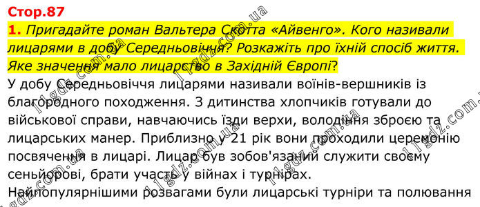 1. Пригадайте роман Вальтера Скотта «Айвенго». Кого називали лицарями в добу Середньовіччя? Розкажіть про їхній спосіб життя. Яке значення мало лицарство в Західній Європі? У добу Середньовіччя лицарями називали воїнів-вершників із благородного походження. З дитинства хлопчиків готували до військової справи, навчаючись їзди верхи, володіння зброєю та лицарських манер. Приблизно у 21 рік вони проходили церемонію посвячення в лицарі. Лицар був зобов'язаний служити своєму сеньйорові, брати участь у війнах і турнірах. Найпопулярнішими розвагами були лицарські турніри та полювання.