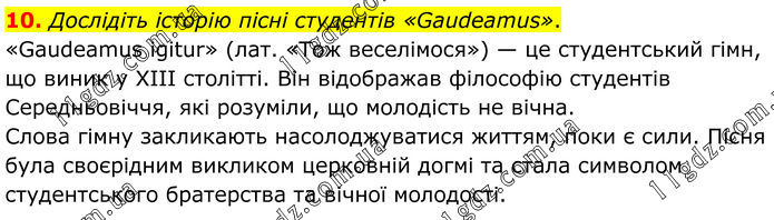 10. Дослідіть історію пісні студентів «Gaudeamus». «Gaudeamus igitur» (лат. «Тож веселімося») — це студентський гімн, що виник у XIII столітті. Він відображав філософію студентів Середньовіччя, які розуміли, що молодість не вічна. Слова гімну закликають насолоджуватися життям, поки є сили. Пісня була своєрідним викликом церковній догмі та стала символом студентського братерства та вічної молодості.